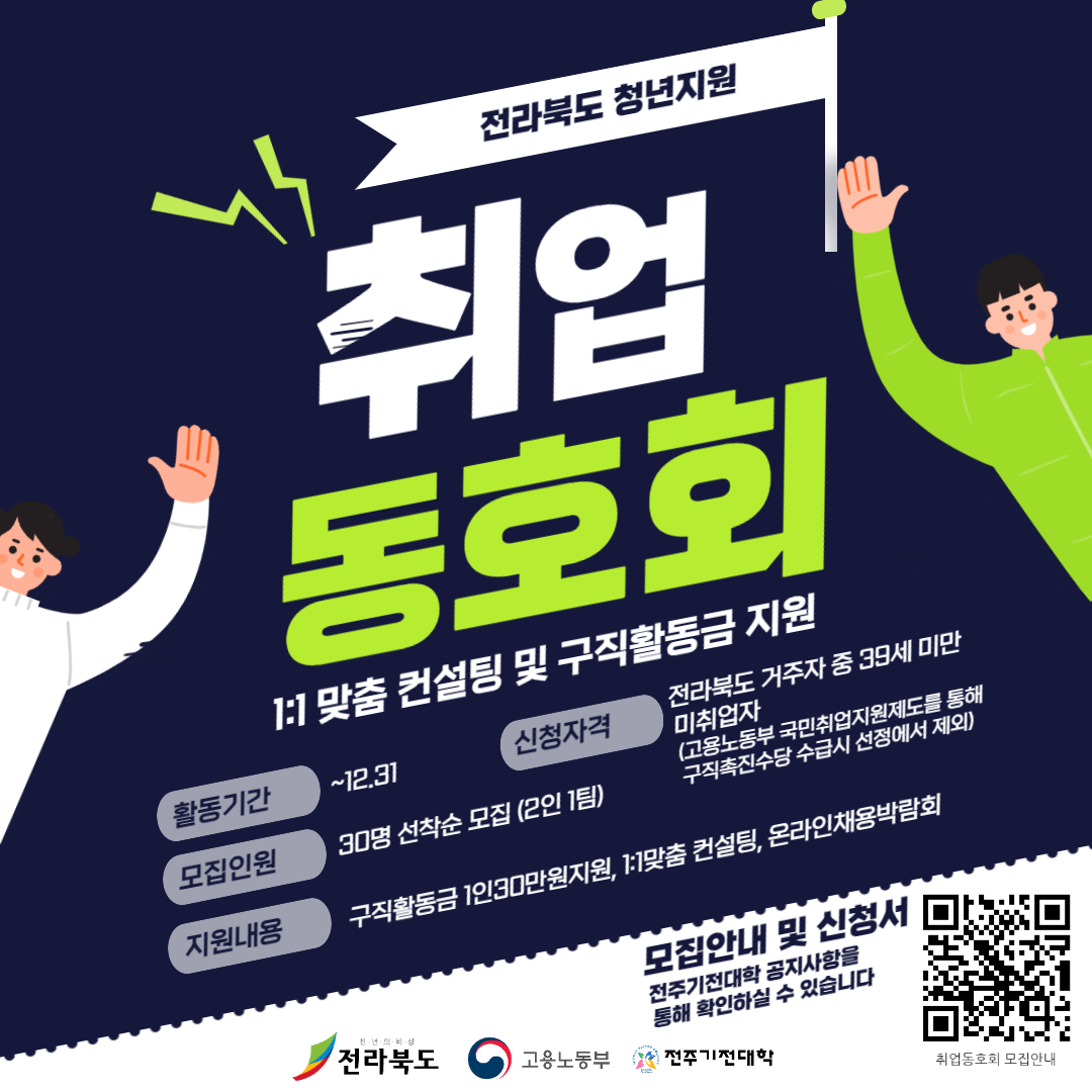 전주기전대학 산학협력단에서 전라북도청, 고용노동부와 연계하여 전라북도내 미취업 청년들을 대상으로 취업동호회를 운영하려고 합니다. 취업준비중인 청년들을 대상으로 1:1 맞춤 컨설팅(이미지메이킹, 이력서 및 자기소개서 작성, 직업심리검사), 온라인채용박람회, 우수산업체 인사담당자와의 1:1 맞춤형 멘토링, 일자리 유관기관과 상호연계, 구직활동비(1인 최대 30만원/ 팀당 총 60만원)를 지원하여 취업에 성공할 수 있도록 프로그램을 운영하려고 합니다. 2인1팀으로 운영되며 친구분들과 한팀으로 운영할 수 있고 팀별로 희망직종에 맞게 컨설팅을 받을 수 있으니 많은 관심과 참여 부탁드립니다.