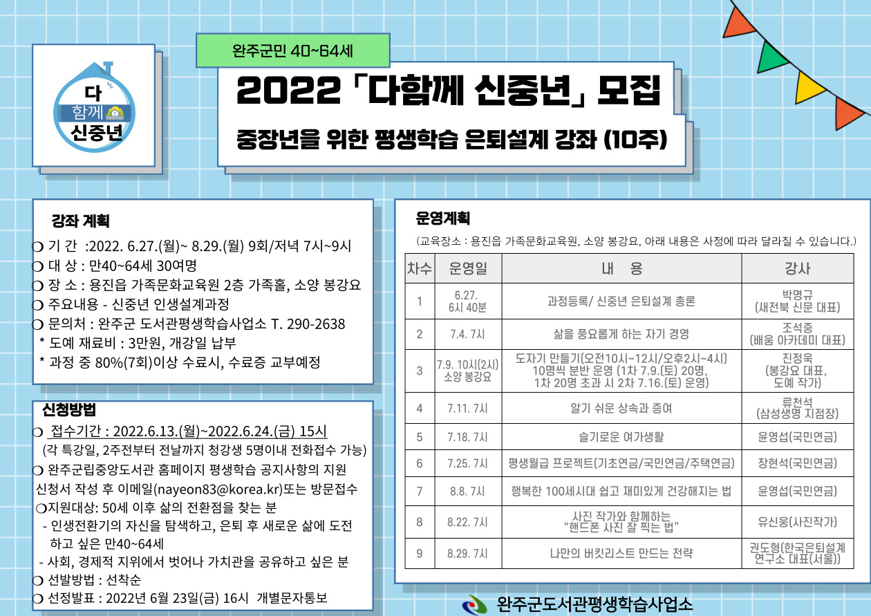 소통참여 군정소식 공지사항 읍면소식 유관기관소식 주간행사계획 축제, 행사, 교육/모집, 기타 보도자료 이미지 갤러리 알림정보 시험/채용 고시공고 고시공고 입찰공고 입법예고 타기관 고시공고 인사동정 공포/발령 완주군보 일자리정보 완주소식지 전자책(e-book) PDF 파일 모바일 군민참여 군수에게 바란다 자유게시판 칭찬합니다 국민생각함 디지털매체 활동가모집 설문조사 누리집개선의견 주민참여예산제도 주민참여예산제도 접수 주민참여예산사업 추진현황 적극행정 적극행정이란 적극행정 우수사례 적극행정 우수공무원 추천 법령유권해석 소극행정 신고센터 규제개혁 규제개혁이란 규제관련정보 규제혁신사례 신고센터 국민신문고 나의민원확인 안전신문고 행정규제신고 예산낭비신고 환경신문고 클린신고 청렴포털(국민권익위원회) 부동산거래부조리신고센터 지방보조금 부조리 신고센터 고향사랑기부제 고향사랑기부제란 답례품 기금활용사업 유의사항 군민증발급 완주세무서 신설 촉구 서명운동 Home 소통참여 군정소식 읍면소식 삼례읍 삼례읍 페이스북 트위터 카카오톡 링크복사 점자솔루션 점자다운로드 100% 삼례읍 봉동읍 용진읍 상관면 이서면 소양면 구이면 고산면 비봉면 운주면 화산면 동상면 경천면 제목 2022 "다함께 신중년" 은퇴설계 강좌(10주) 모집 작성자 도서관평생학습사업소 등록일 2022-06-25 연락처 063-290-2638 첨부파일 다함께신중년지원신청서.hwp(42KB) (42KB / 다운로드:49회 ) 1705551990242420866.hwp 미리보기 접수일이 지났지만, 인원이 차지 않아 접수일 5일 연장하여 추가모집 하오니 많은 참여바랍니다. 목록